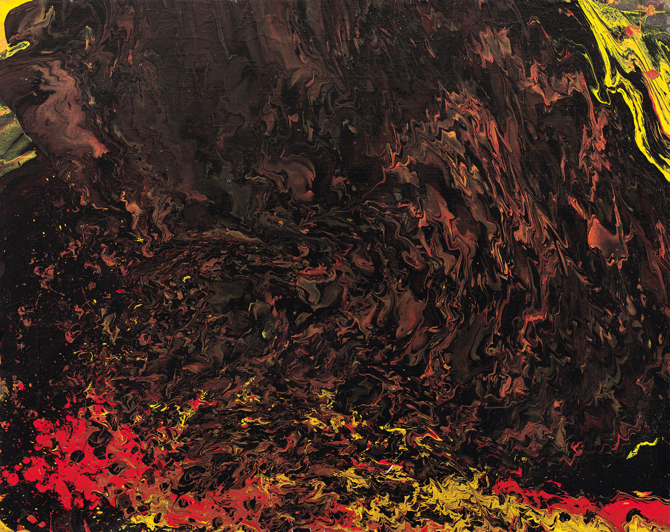 Banal gestic painting combined with throwing and vibrating the painting brought interesting results that promised commercial success in the area of sitting-room art. The use of templates further heightened ambitions. Unfortunately, these ambitions were not fulfilled. To this day, I have sold only two smallish paintings, and those only to my friends and for negligible money. I tried to find out where it all went wrong. I would hang around Prague patisseries, staring into their windows at the contemporary work in marzipan. Most likely, the problem was that the investors did not believe in the laboriousness of these paintings, but the opposite was the case. Or perhaps in their simplicity of form they were ahead of their time, and people and their homes were not ready for them. Anyway, sometime in 2010 my supply of Eternal ran out, and so this cycle came to an end all on its own.